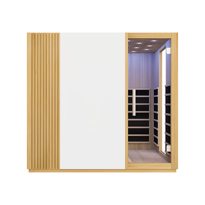 2 Person Sauna Room STANDARD : Production Details : Interior Wood: Hemlock Exterior Wood: Melamine Board & Hemlock Power: 4270W Infrared Heating Panel & Redlight Heating Tube Touch Control Panel with Bluetooth, USB, FM LED Starlight Ultra-comfortable recliner Clear Tempered Glass Cabinet Size: 2000*1600*1950mm 20’GP: 8PCs 40’HQ: 20PCs |